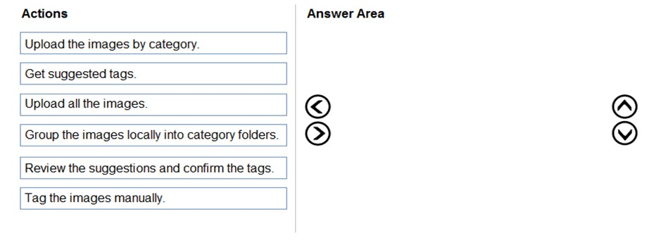 DRAG DROP - You train a Custom Vision model used in a mobile app. You receive 1,000 new images that do not have any associated data. You need to use the images to retrain the model. The solution must minimize how long it takes to retrain the model. Which three actions should you perform in the Custom Vision portal? To answer, move the appropriate actions from the list of actions to the answer area and arrange them in the correct order. Select and Place: