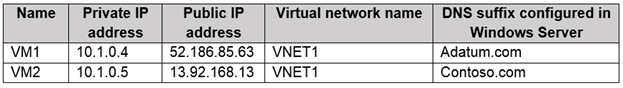 You create a private Azure DNS zone named adatum.com. You configure the adatum.com zone to allow auto registration from VNET1. Which A records will be added to the adatum.com zone for each virtual machine? To answer, select the appropriate options in the answer area. NOTE: Each correct selection is worth one point. Hot Area: