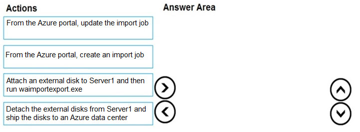 DRAG DROP - You have an Azure subscription that contains a storage account. You have an on-premises server named Server1 that runs Windows Server 2016. Server1 has 2 TB of data. You need to transfer the data to the storage account by using the Azure Import/Export service. In which order should you perform the actions? To answer, move all actions from the list of actions to the answer area and arrange them in the correct order. NOTE: More than one order of answer choices is correct. You will receive credit for any of the correct orders you select. Select and Place: