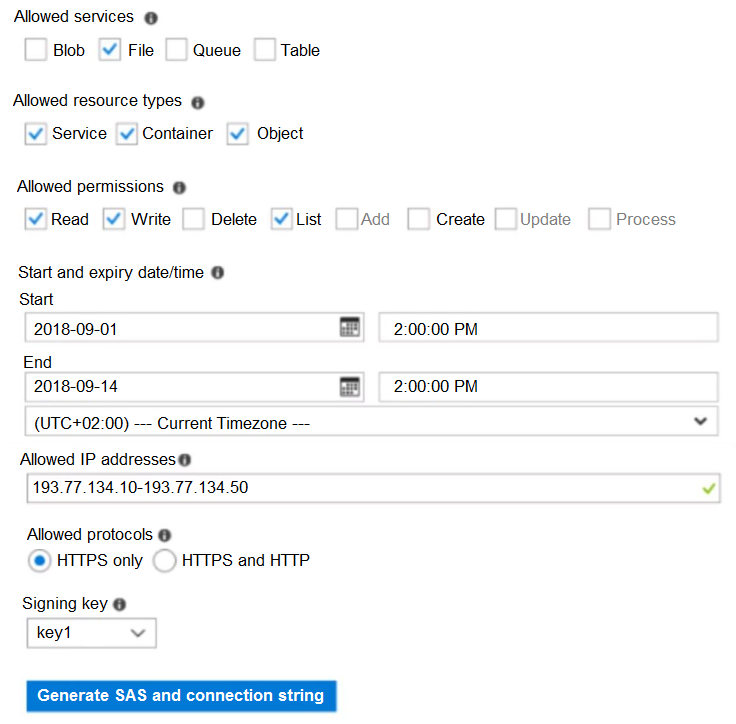 HOTSPOT - You have an Azure subscription named Subscription1. In Subscription1, you create an Azure file share named share1. You create a shared access signature (SAS) named SAS1 as shown in the following exhibit: