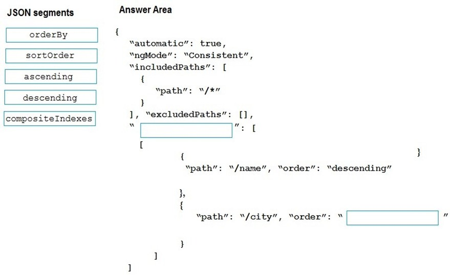 You need to configure a Cosmos DB policy to support the query. How should you configure the policy? To answer, drag the appropriate JSON segments to the correct locations. Each JSON segment may be used once, more than once, or not at all. You may need to drag the split bar between panes or scroll to view content. NOTE: Each correct selection is worth one point. Select and Place:
