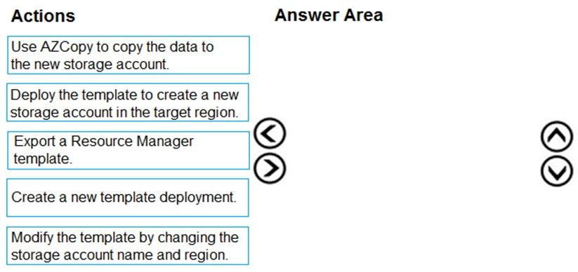 DRAG DROP - You are developing an application to use Azure Blob storage. You have configured Azure Blob storage to include change feeds. A copy of your storage account must be created in another region. Data must be copied from the current storage account to the new storage account directly between the storage servers. You need to create a copy of the storage account in another region and copy the data. In which order should you perform the actions? To answer, move all actions from the list of actions to the answer area and arrange them in the correct order. Select and Place: