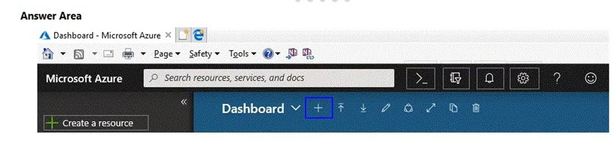 Pass: The correct Azure portal icon to open Azure Cloud Shell is the terminal/command prompt icon (commonly shown as ">_" in the top bar). In the provided image, this appears as the ">_" symbol near the upper-right area of the portal header. Selecting this icon launches Cloud Shell in a pane within the portal, allowing you to run Azure CLI or Azure PowerShell commands authenticated to your account. Why not the other visible icons? The bell is Notifications, the gear is Settings, the question mark is Help, and the smiley is Feedback. The highlighted "+" on the dashboard toolbar relates to adding dashboard tiles/resources to the dashboard view, not opening Cloud Shell. Therefore, choosing the ">_" icon is the correct action for managing Azure using Azure Cloud Shell.