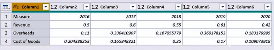 DRAG DROP - You are preparing a financial report in Power BI. You connect to the data stored in a Microsoft Excel spreadsheet by using Power Query Editor as shown in the following exhibit.