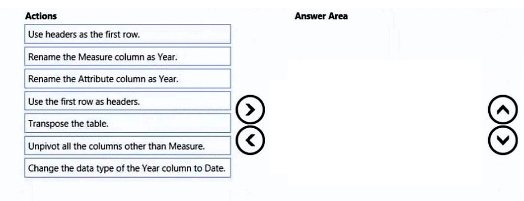 You need to prepare the data to support the following: ✑ Visualizations that include all measures in the data over time ✑ Year-over-year calculations for all the measures Which four actions should you perform in sequence? To answer, move the appropriate actions from the list of actions to the answer area and arrange them in the correct order. Select and Place:
