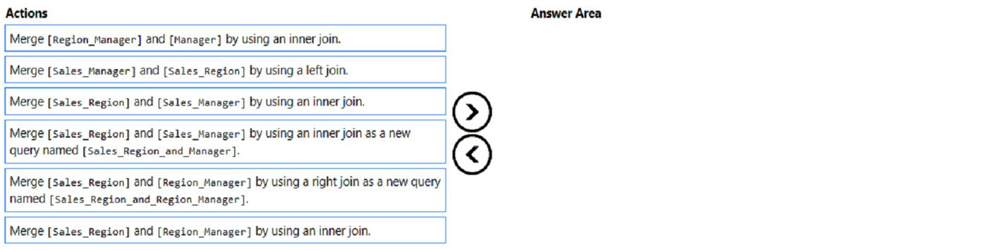 Region_Manager | region_id | Integer | manager_id | Integer Sales_Manager | sales_manager_id | Integer | name | Varchar | region_id | Integer Manager | manager_id | Integer | name | Varchar The model has the following relationships: ✑ There is a one-to-one relationship between Sales_Region and Region_Manager. ✑ There are more records in Manager than in Region_Manager, but every record in Region_Manager has a corresponding record in Manager. ✑ There are more records in Sales_Manager than in Sales_Region, but every record in Sales_Region has a corresponding record in Sales_Manager. You need to denormalize the model into a single table. Only managers who are associated to a sales region must be included in the reports. Which three actions should you perform in sequence? To answer, move the appropriate actions from the list of actions to the answer area and arrange them in the correct order. NOTE: More than one order of answer choices is correct. You will receive credit for any of the correct orders you select. Select and Place: