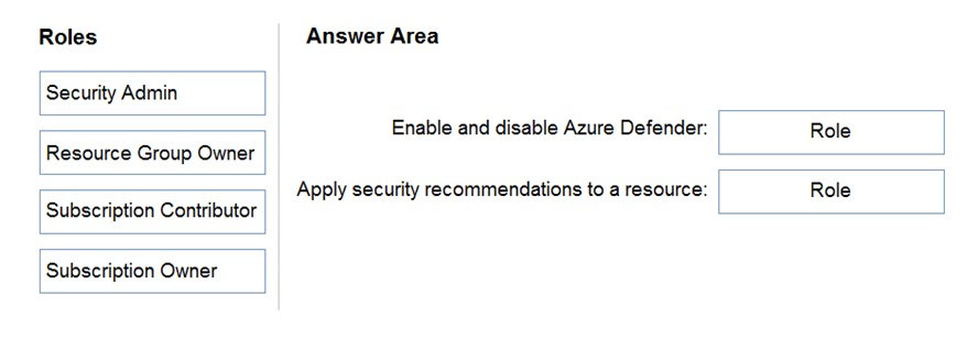 DRAG DROP - You have an Azure subscription. You need to delegate permissions to meet the following requirements: ✑ Enable and disable Azure Defender. ✑ Apply security recommendations to resource. The solution must use the principle of least privilege. Which Azure Security Center role should you use for each requirement? To answer, drag the appropriate roles to the correct requirements. Each role may be used once, more than once, or not at all. You may need to drag the split bar between panes or scroll to view content. NOTE: Each correct selection is worth one point. Select and Place: