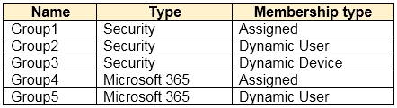 You have an Azure Active Directory (Azure AD) tenant that contains the groups shown in the following table.