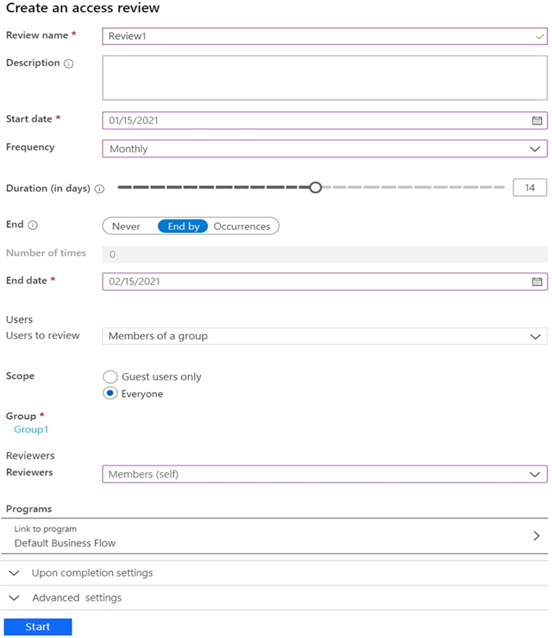 HOTSPOT - You have an Azure Active Directory (Azure AD) tenant that contains the following group: ✑ Name: Group1 ✑ Members: User1, User2 ✑ Owner: User3 On January 15, 2021, you create an access review as shown in the exhibit. (Click the Exhibit tab.)