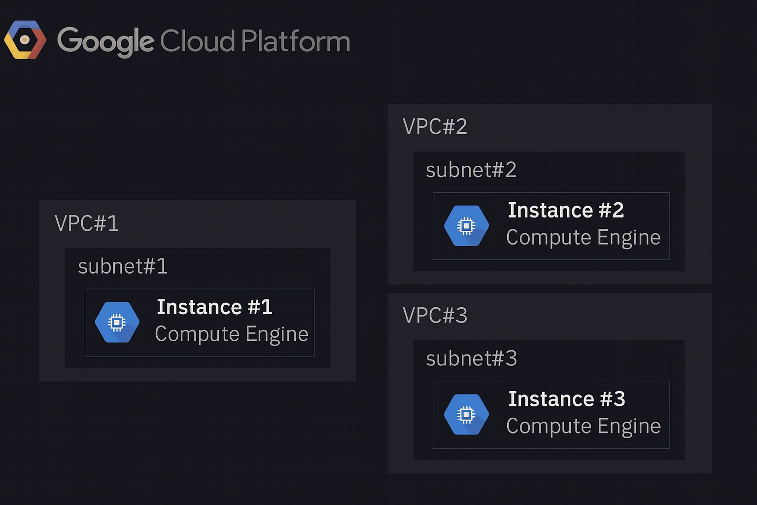Refer to the dark-mode network diagram shown below: your company has three separate VPCs in Google Cloud, each containing one Compute Engine instance. Subnets do not overlap and must remain isolated. Instance #1 is a special case and must communicate directly with Instance #2 and Instance #3 using internal IP addresses. What should you do?